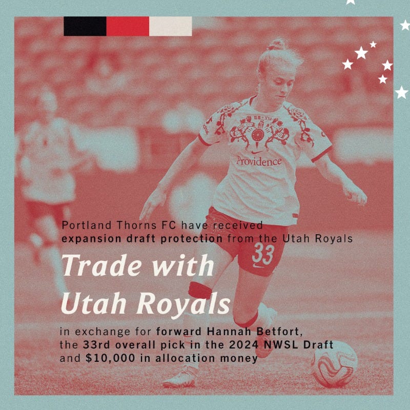 In the second trade of the day, Portland Thorns received expansion draft protection from Utah Royals FC in exchange for forward Hannah Betfort, the 33rd overall pick in the 2024 NWSL Draft and $10,000 in allocation money. This grants the club full protection in the 2023 NWSL expansion draft.