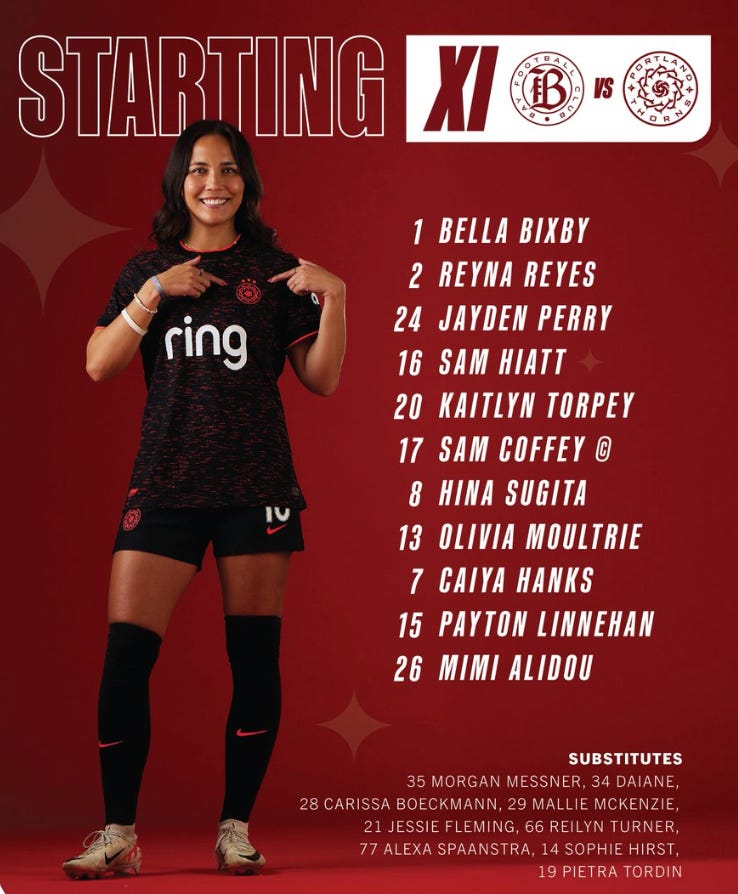 As promised, Rob Gale rolled out a lineup that aligned with what he told us would be a ‘mixed bag’ of player unavailabilities ahead of tonight’s match. Along with Mackenzie Arnold continuing rehab on that leg injury, Deyna Castellanos (back) and Isabella Obaze (injury) were also unavailable for the Thorns tonight.
